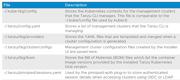 - config - stores Kubernetes contexts for management clusters managed by the Tanzu CLI